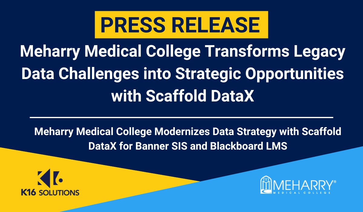CHANDLER, Ariz., April 22, 2025 /PRNewswire/ -- K16 Solutions Inc., the leader in higher education data management and automation, today announced that Meharry Medical College has chosen Scaffold DataX to integrate historical Banner SIS and Blackboard LMS data into a centralized, structured environment for enhanced reporting and decision-making. As part of its broader initiative to migrate from Banner SIS to Workday SIS, Meharry will also use Scaffold DataX as a cost-effective archive solution for its legacy Banner data, eliminating the need to maintain an expensive, read-only Banner instance. By unifying its data and reducing costs, Meharry is strengthening its data infrastructure for a more efficient, analytics-driven future.
