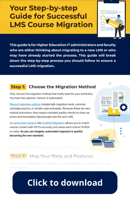 This guide is for Higher Education IT administrators and faculty who are either thinking about migrating to a new LMS or who may have already started the process. This step-by-step guide for successful LMS course migration will break down the process you should follow to ensure your project’s completion.